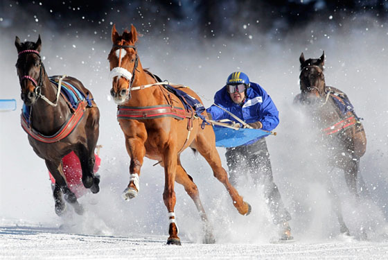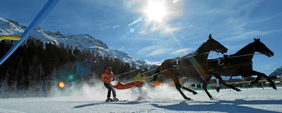 Помимо плоских гонок, смелые мужчины и амазонки на лыжах. держась за поводья, следуют за лошадьми вдоль 2700-метрового трека. Это — единственная гонка в мире — Скиджоринг (Skrikjoring), денежный приз которого составляет более 329 000 USD. Удивительно, как лошади не наступают на лыжи жокеев на скорости 50 км в час. Это опасная гонка и желанный кубок Skikjöring и титул «Короля Энгадине», безусловно, является заслуженным.