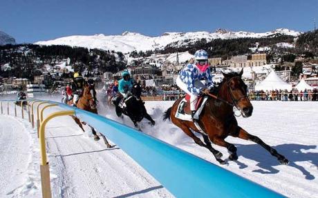 Санкт-Мориц — это курортный город в долине Энгадин в швейцарском кантоне Граубюнден. Этот изысканный лыжный курорт для европейских знаменитостей, супер богатых и больше русских миллиардеров, является очень популярным и невероятно гламурными. Каждый год в феврале в течение первых трех выходных, здесь проводится гонка White Turf (Белая трасса). Более 30 000 зрителей стекаются в замороженные просторы озера Санкт-Мориц наблюдать волнение скачек на фоне гор Энгадин.