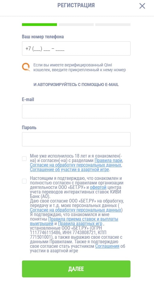 - Шаг 3. Заполните короткую анкету, указав имя и фамилию, телефон, почту и пароль. На этой же странице подтвердите, что вам есть 18 лет, и что вы согласны соблюдать правила букмекера.