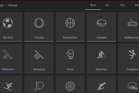 Линия в букмекерской конторе Олимп структурирована по видам спорта. Это касается обоих крупных категорий, доступных для ставок – и лайва и прематча. Если вы обратите внимание на правую сторону центрального блока с перечнем видов спорта, то обнаружите возможность для сортировки событий ещё и по времени их начала. В частности, есть 3 доступных варианта – 6 часов, 12 часов и 24 часа. Кликнув на любой из этих вариантов, вы преобразуете линию таким образом, что в ней будут лишь поединки, стартующие в указанный вами временной отрезок.