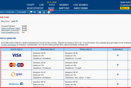 Легальные операторы ставок не работают с системой Webmoney, поэтому пополнение счета этим методом невозможно. Если вы играете в международной версии Marathonbet, то этот сервис доступен для ввода средств. Для этого надо войти в свой аккаунт, выбрать вкладку «Сервисы» – «Внести средства» и выбрать в предложенном списке платежных методов Webmoney. Затем оформить несколько полей во всплывшем окне, перейти в систему «Вебмани» и завершить сделку. Комиссия не взимается. Минимум для внесения – 80 руб.