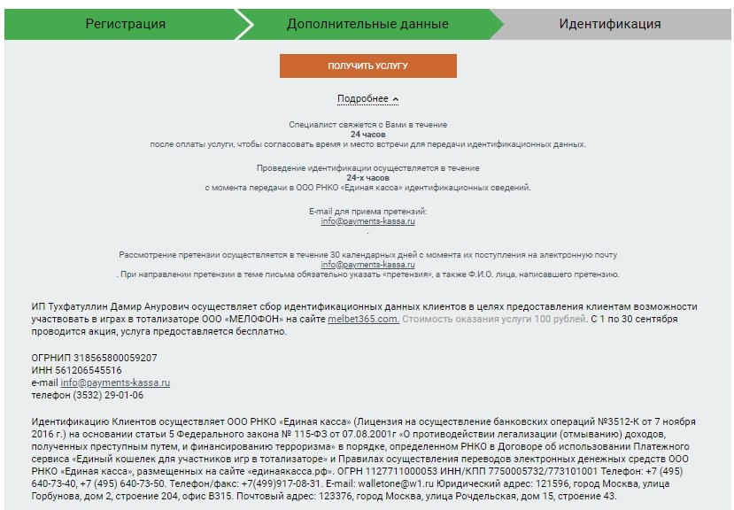 - Шаг 4. Процедура регистрации завершена, беттору остается только пройти процедуру упрощенной или полной идентификации. В первом случае необходимо отправить требуемые фото паспорта службе поддержки букмекера, а также заполнить паспортные данные и данные о месте проживания в соответствующих полях. Во втором — требуется отправиться с паспортом в ближайший салон Contact или «Связной», где сообщить оператору о желании пройти идентификацию в Melbet.
